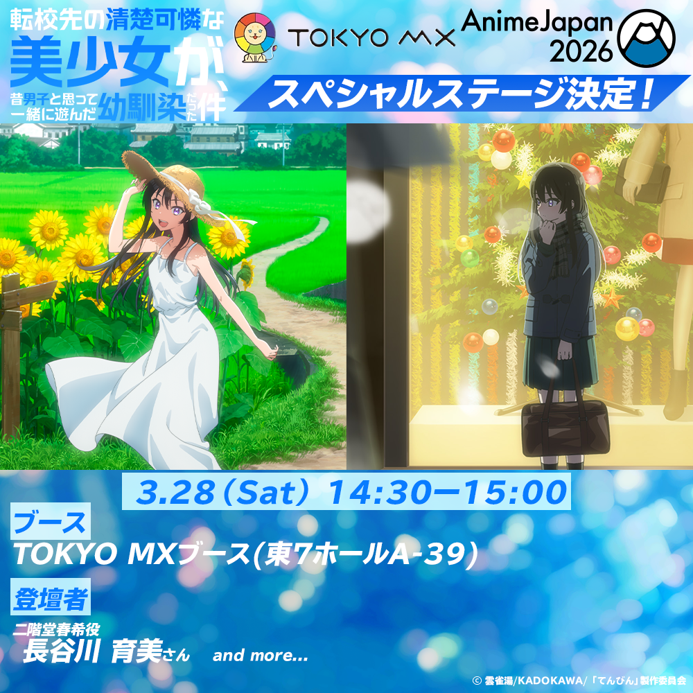 2026 03/06 AnimeJapan2026ブース出演決定! AnimeJapan2026 TOKYO MXブースにて『転校先の清楚可憐な美少女が、昔男子と思って一緒に遊んだ幼馴染だった件』キャスト登壇ステージが開催決定! 日時:2026年3月28日(土)14:30〜15:00場所:TOKYO MX ブース出演:長谷川育美 (二階堂春希 役)ほか